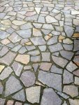 - Pflaster: Blaubasalt-Pflaster 12/16 mit Sakret-Fugenmörtel verfugt